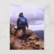 This postcard features fine art photography of a hiker on the Edmunds Path approaching the rocky summit of Mt. Eisenhower in the White Mountains of New Hampshire. Until 1972 this mountain was known as Mt Pleasant. It was renamed by the NH state legislature in honor of the former president. The summit is open with 360 degree views. The peak is set in the middle of the southern Presidential range, between Monroe to the north and Pierce to the south, high above Crawford Notch. Mount Washington looms in the distance along with a stormy gray sky.