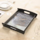 This is a well made, sturdy wooden tray with a flawless black finish and lovely map on the tray surface. It is both vintage & modern at the same time. Looks exactly like the photo; does not disappoint. So nice to find something of quality individually made and not the mass-produced 'shabby chic' merchandise seen in stores. I am so pleased to be able to give this to my college-age niece for her birthday. This can be used as a tray to hold jewelry or toiletries, or hung on the wall as art. The map surface is sealed (it is slightly shiny) so would be moisture resistant. It is well worth the asking price but I was able to apply a sale code as well. Very happy with my purchase. Map is crisp & clear and sealed with a water-resitant finish.