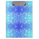A clipboard featuring a blue and teal bokeh pattern, with round white dots giving it a soft, calming effect. The metallic clip is shiny and reflective.