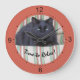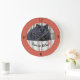 Black cat relaxing on striped cushions. Cushions are green, red, beige and white vertical stripes. Outer rim of clock is matches the red in the cushions. Beneath the cat is text "Time to Relax!"