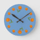 Calendula blossoms are arranged as the numeral positions on this clock. The orange blossoms at 12, 3, 6, and 9 have stems and leaves pointing towards the center, the other "numbers" are slightly smaller, with no stems. Customize/Edit to change the background color to your liking.