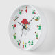 1:00 = Elf Hanging Mistletoe; 2:00 = Elf Sledding; 3:00 = Elf with Candy Cane; 4:00 = Elf with a Telescope Watching for Santa; 5:00 = Elf Admiring a Christmas Tree; 6:00 = Elf with a Christmas Candle; 7:00 = Elves Under Mistletoe; 8:00 = Elf with Christmas Pie; 9:00 = Elf with a Christmas Present; 10:00 = Elf Tobogganing; 11:00 = Elves Holding Hands; 12:00 = Santa. Santa's jolly face fills the middle of the clock.