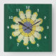 Crochet pattern of daisy in yellows, gray and hunter green. Clock numerals are in white.