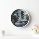 A wall clock featuring a photo of four ducks swimming on a shimmering pond.
