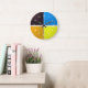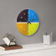 Squares in four colors: corners meet in the middle of the clock face. Blue, yellow, orange and black cover the hours relating to morning, afternoon, evening, and night and have three dimensional looking edges. White numerals show on top of the tiles.