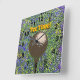 Tee Time! Golf ball atop a tee, sits against a background of green, blue, yellow and purple dots. Black numerals and minute markers.