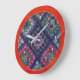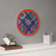 Granny square patterned afghan in multiple colors. Framed with a red ring that looks 3D. White numerals .
