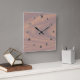 A photo-representation of dark brown wood grain is lightened for the background on the clock face. The numbers are a three-D metallic look.