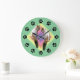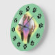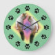 Long haired calico cat viewing it's mirrored image, standing in front of a diamond shape in pastel rainbow colors. Cat is mostly white with browns, and black patterned fur. Clock "numbers" are black paw prints with 4 toes.