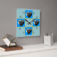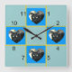 Pet pictures. Personalize with an image of your pet to show in the 12, 3, 6, and 9 spots on this "patch work quilt" clock. Your square image will be placed within the blue heart shaped frame. Background may be Customized/edited to color of your choice.