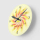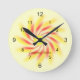 Pinwheel design in red, orange and yellows, on a pale yellow background, sits behind the numbers on the clock face. The 12, 3, 6, and 9 numerals are larger than the remaining numbers. Personalize with your Text (company or family name, or ?). Further customization is possible by Customizing/Editing the background color (pale yellow)