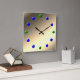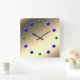 A numberless clock that was inspired by a wall clock in our "new" house in the 1960s. Green balls sit at the 12, 3, 6, and 9 positions; Blue balls at the other number points. Background is golden metallic looking.