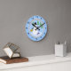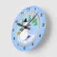Snowman is shoveling the snow wearing his top hat. Pine trees are in the background. The 3d globe stands out against the background color (you may customize/edit to your choice) of the clock.
