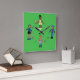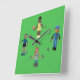 Dolls dressed for various sports, sit at the 12, 3, 6, and 9 positions. Two females, two males. Skin tones to represent various ethnicities. Sports shown, include tennis, baseball, gymnastics, and bicycling. Dolls stand in front of 3-d looking silver numerals on a green background.