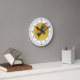 Rooster strutting in front of yellow sun. Image shows crackling from original ceramic work by Nora Chen. Red cox comb, green and brown feathers. Black numerals inside ring segments marking minutes.