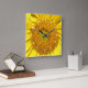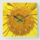 Center of brilliant yellow sunflower. Close-up photo of the central geometric circles of the "seeds" are the base of the clock hands. White numerals are at outer edge near the yellow petals. A fly is browsing near the number 10.