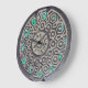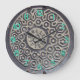 Manhole cover for telephone company access, Black metal pattern of hexagons surround the company emblem. Three dimensional blue-green numerals mark the hours.