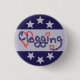 This clogging design features red faded / distressed hearts and dark blue letters that say "Clogging" with stars on them. This button also has a dark-blue border with stars. It's a pretty design for a clogger / anyone who loves clog dancing.