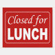 Closed for lunch sign for the door or window of your business or office to let customers or others know you are out to lunch and will return. Attention getting red and white colors.