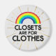Gay pride themed magnet features large rainbow with "closets are for clothes" in bold black text on light gray background with gold starburst