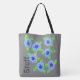 Designer grey floral fabric bag for stuff. Ideal travel, office, market, grocery or designer cloth gift bag. Flower pattern in blue and purple on grey. The light grey background can be changed to your favourite color. The text can also be personalized or is removable.