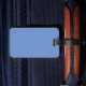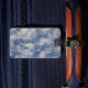 A Luggage Tag with a Picture of Clouds and Sky on the Front and Blue Color/Blank on Back.