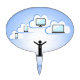 Cloud computing concept with a man, computer, tablet, smart phone in clouds