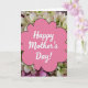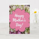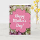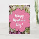 This Mother's Day card features a rounded pink speech-bubble shape centered on the front, outlined with a thin dark edge that gently separates it from the floral background. Inside the pink shape, the words “Happy Mother’s Day!” sit in crisp white lettering, centered and easy to read, like a sweet note shared face to face ❤️. Surrounding the message is a close, garden-like ring of clustered blossoms that feels like a soft embrace around the greeting. The flowers shift from bright white at the top into pale green tones, then drift into muted lavender and light pink near the bottom, adding a quiet romantic touch 🌼. Soft, diffused lighting highlights the tiny petal textures, giving the arrangement a tender, caring look without harsh shadows. The contrast between the smooth graphic center and the airy petals suggests closeness, like a gentle conversation held among flowers. The background is filled edge to edge with small blooms and green hints, with the lavender and pink tones most noticeable along the lower portion.