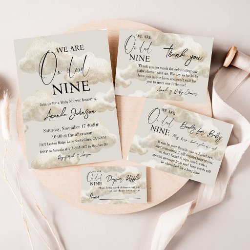 Elegant watercolor beige calligraphy Baby Shower Welcome Sign with title "We are On cloud nine".