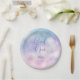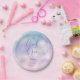 Dreamy and elegant baby shower plate featuring watercolor art of pink and purple sky with clouds and stars. The text says "we are on cloud nine."