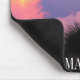 This inspirational Mouse Pad is an original photograph by MaeFlowers of clouds in the eastern sky reflecting the sunset in the west, over the Gulf of Mexico. The tropical evening sky is bathed in a warm pink glow above the dark silhouette of palm trees. The clouds are developing into very interesting shapes, looking almost like fluffy toys or...use your imagination...the soft pink colors of the sheer clouds near the bottom of the photo intensify as the sun hits the thick, billowing shapes of the thicker clouds rising into the sky. The puffy shapes at the top of the clouds have yellow highlights. Centered near the bottom of the mousepad is the word IMAGINE, in tall thin white capital letters over the dark background of palm trees. This text is set to be personalized, or deleted as you like.