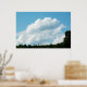 A photograph of a group of large white clouds floating over a grouping of trees.