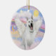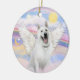 A White German Shepherd angel floats in heaven's fluffy clouds with a shining sun and star and moon in the distance