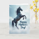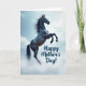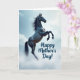 This card shows a dark horse rearing in midair, set against a pale blue sky with thin, wispy clouds that drift like soft ribbons. The horse sits slightly off-center, its arched neck and lifted front legs giving it a proud, almost dance-like pose that feels like a gentle tribute ❤️. Light falls across its coat in smooth highlights, and the flowing mane and tail curl backward as if caught by a calm breeze. The contrast between the deep charcoal body and the airy background adds a quiet closeness, like the horse is reaching upward with affectionate strength for someone it trusts. Near the top area, the words “Happy Mother’s Day!” appear in rounded, deep-blue lettering, spaced so they don’t crowd the artwork. The overall palette stays cool and soothing, with the sky’s soft tones and the horse’s darker shape balancing each other 🌼. Small details like the glossy sheen on the coat and the clearly defined hooves stand out against the cloud-flecked blue.