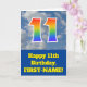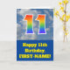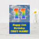 The front of this fun 11th birthday greeting card design features a representation of a cloudy blue sky, along with the number "11" having a multicolored rainbow spectrum like gradient look. The front also features a birthday greeting message, including a customizable recipient name. The inside features a personalized birthday greeting message, or could perhaps be cleared and left blank if a message is to be written by hand instead. A custom birthday card like this might be a fun way to send birthday wishes to somebody who is celebrating their eleventh birthday. [~Z0000370]