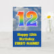 The front of this fun 12th birthday greeting card design features a representation of a cloudy blue sky, along with the number "12" having a multicolored rainbow spectrum like gradient look. The front also features a birthday greeting message, including a personalized recipient name. The inside features a customized birthday greeting message, or could perhaps be cleared and left blank if a message is to be written by hand instead. A customizable birthday card like this might be a fun way to acknowledge somebody’s twelfth birthday. [~Z0000370]