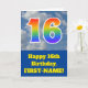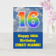 The front of this fun 16th birthday greeting card design features a cloudy blue sky depiction, along with the number "16" having a multicolored rainbow spectrum like gradient look. The front also features a birthday greeting message, including a custom recipient name. The inside features a custom birthday greeting message, or could perhaps be cleared and left blank if a message is to be written by hand instead. A customizable birthday card like this might be a fun way to send birthday wishes to somebody who is celebrating their sixteenth birthday. [~Z0000370]
