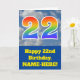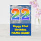 The front of this fun 22nd birthday greeting card design features a cloudy blue sky depiction, along with the number "22" having a multicolored rainbow spectrum like gradient pattern. The front also features a birthday greeting message, including an editable recipient name. The inside features a customized birthday greeting message, or could perhaps be cleared and left blank if a message is to be written by hand instead. A personalized birthday card like this might be a fun way to send birthday wishes to somebody who is celebrating their twenty second birthday. [~Z0000370]