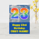 The front of this fun 23rd birthday greeting card design features a representation of a cloudy blue sky, along with the number "23" having a multicolored rainbow spectrum like gradient look. The front also features a birthday greeting message, including a personalized recipient name. The inside features an editable birthday greeting message, or could perhaps be cleared and left blank if a message is to be written by hand instead. A personalized birthday card like this might be a fun way to acknowledge somebody’s twenty third birthday. [~Z0000370]