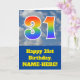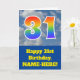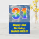 The front of this fun 31st birthday greeting card design features a depiction of a blue sky with clouds, along with the number "31" having a multicolored rainbow spectrum like gradient pattern. The front also features a birthday greeting message, including a customized recipient name. The inside features a customized birthday greeting message, or could perhaps be cleared and left blank if a message is to be written by hand instead. A personalized birthday card like this might be a fun way to send a message in celebration of somebody’s thirty first birthday. [~Z0000370]