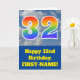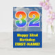 The front of this fun 32nd birthday greeting card design features a representation of a cloudy blue sky, along with the number "32" having a multicolored rainbow spectrum like gradient look. The front also features a birthday greeting message, including a personalized recipient name. The inside features a personalized birthday greeting message, or could perhaps be cleared and left blank if a message is to be written by hand instead. A custom birthday card like this might be a fun way to send birthday wishes to somebody who is celebrating their thirty second birthday. [~Z0000370]