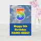 The front of this fun 5th birthday greeting card design features a cloudy blue sky depiction, along with the number "5" having a multicolored rainbow spectrum like gradient look. The front also features a birthday greeting message, including an editable recipient name. The inside features a customized birthday greeting message, or could perhaps be cleared and left blank if a message is to be written by hand instead. A personalized birthday card like this might be a fun way to send birthday wishes to somebody who is celebrating their fifth birthday. [~Z0000370]