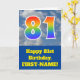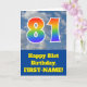 The front of this fun 81st birthday greeting card design features a depiction of a blue sky with clouds, along with the number "81" having a multicolored rainbow spectrum like gradient pattern. The front also features a birthday greeting message, including an editable recipient name. The inside features a personalized birthday greeting message, or could perhaps be cleared and left blank if a message is to be written by hand instead. A personalized birthday card like this might be a fun way to acknowledge somebody’s eighty first birthday. [~Z0000370]