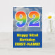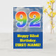 The front of this fun 92nd birthday greeting card design features a cloudy blue sky depiction, along with the number "92" having a multicolored rainbow spectrum like gradient pattern. The front also features a birthday greeting message, including a customizable recipient name. The inside features a personalized birthday greeting message, or could perhaps be cleared and left blank if a message is to be written by hand instead. A customizable birthday card like this might be a fun way to acknowledge somebody’s ninety second birthday. [~Z0000370]
