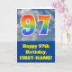 The front of this fun 97th birthday greeting card design features a representation of a cloudy blue sky, along with the number "97" having a multicolored rainbow spectrum like gradient look. The front also features a birthday greeting message, including a personalized recipient name. The inside features an editable birthday greeting message, or could perhaps be cleared and left blank if a message is to be written by hand instead. A personalized birthday card like this might be a fun way to acknowledge somebody’s ninety seventh birthday. [~Z0000370]