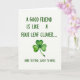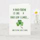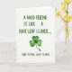 This greeting card features a white background with centered text that reads, “A GOOD FRIEND IS LIKE A FOUR LEAF CLOVER... HARD TO FIND, LUCKY TO HAVE,” set in a friendly, easy-to-read sans-serif style in dark gray. Between the two parts of the quote sits a watercolor clover, acting like a small pause in the message, as if two close friends are sharing a quiet glance over something sweet. The clover’s leaves are painted in layered greens—deep emerald near the middle fading into lighter jade along the edges—giving it a soft, airy look 💚. The gentle color transitions and slightly uneven watercolor edges make it feel like the clover was brushed on with care, like a thoughtful note left for someone you’d miss. The quote stays neatly centered from top to bottom, with the clover placed right in the middle so your eye naturally moves from the first line to the last. The white space around everything keeps the design open and calm, letting the green stand out without distractions ☘️. The shamrock shows three rounded leaves and a slim stem, with translucent washes and darker pooling of paint near the leaf bases.