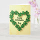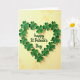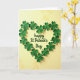 This greeting card shows a heart shape built from many emerald-green four-leaf clovers, each one looking like a soft cutout with gently rounded edges. The clovers fit closely together, like a sweet bouquet arranged for someone you care about, with their shapes leaning into one another in a cozy way 💚. In the center of the clover heart, the words “happy St. Patrick’s Day” sit neatly, written in deep green with smooth, flowing letters. The text is placed inside the heart so it feels held by the clovers, like a quiet note tucked into a lucky charm ☘️. Soft, even lighting creates small shadows under the clovers, giving them a raised, touchable look. Behind everything is a pale yellow background with faint, watercolor-like washes that keep the scene gentle and warm. The green heart stands out clearly against the mellow yellow field, with each clover showing subtle curves and tiny shadowed edges.