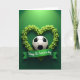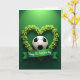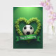 Designed with a classic black-and-white soccer ball centered inside a heart-shaped wreath of four-leaf clovers, this St. Patrick’s Day card mixes sporty charm with a sweet, close-to-the-heart feel 💚. The clovers are rounded and lush in rich green, and each one has a tiny pearl-like bead in the middle that catches the light like a small shared secret between friends. Behind the main design, the background fades from deep forest green to lighter emerald, giving the scene gentle depth. A soft glow from above adds glossy highlights to the ball and a faint sheen along the clover edges, like they’re freshly brushed with morning dew ☘️. Beneath the heart wreath, an emerald ribbon banner curves across the lower portion of the card. The message “Happy St. Patrick’s day” sits centered on that ribbon in a light-colored, flowing calligraphic style that stands out clearly against the darker green. The heart outline formed by the clovers frames the soccer ball closely, and the pearl-like centers create a dotted sparkle that leads your eye around the wreath. Share St. Patrick’s Day sentiments with someone special, and let the curved green banner rest below the heart like a soft ribbon in the foreground.
