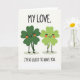 This design shows two four-leaf clovers standing close together on a softly shaded oval “ground,” like they’ve stepped into a quiet little moment just for each other 💚. One clover is a deeper emerald green while the other is a lighter, springy lime, and their colors contrast gently against the off-white background. They wear small, upward smiles with closed, content eyes, and each has bright orange blush circles that make their faces look sweetly bashful, as if they’re sharing a private joke ☘️. Their thin stems and stick-like legs lean subtly inward, adding to the sense of closeness and easy friendship. Centered near the top, the words “MY LOVE.” appear in a dark, hand-drawn lettering style, leaving plenty of open space around it. Along the bottom, “I’M SO LUCKY TO HAVE YOU.” is placed in the same dark lettering, balancing the layout beneath their feet. Soft, even lighting keeps the scene gentle, and the oval shadow under them anchors the two clovers side-by-side.