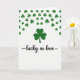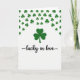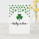 This card features a large three-leaf clover in deep emerald green centered on a bright white background, setting a simple St. Patrick’s Day scene with a romantic twist 💚. The clover sits like a lucky token, as if meant to be passed between two people with a soft, affectionate glance. Just below it, the words “lucky in love” appear in thin, flowing black lettering, placed neatly under the main symbol. Around the top edge and down the sides, many smaller green shamrocks scatter in a loose arc, guiding your eye back toward the center ☘️. The spacing feels airy, like confetti drifting at a quiet celebration shared by close friends or sweethearts. Strong green-on-white contrast keeps the focus on the clover and the message, while the smaller shapes add gentle motion without crowding the page. The tiny shamrocks cluster most along the upper margin and taper toward the corners, leaving the middle open and bright.
